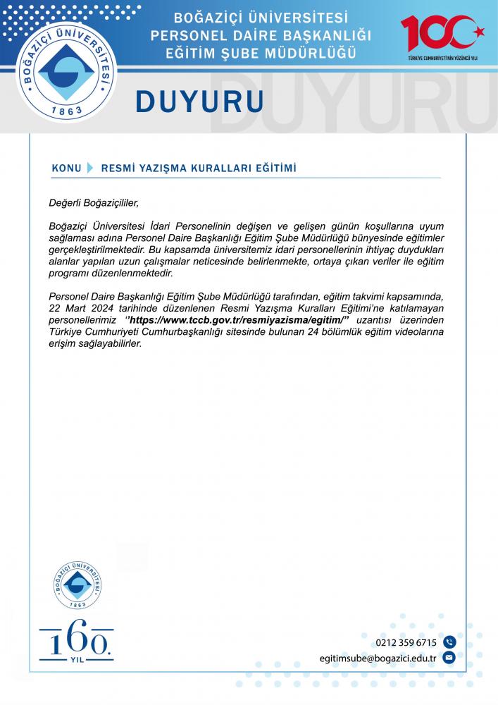 Administrative staff members who were unable to attend the Official Correspondence Rules Training, which was organized by the Training Branch Directorate of the Department of Personnel Affairs on March 22, 2024, as part of the training schedule, may access the 24-part training videos available on the official website of the Presidency of the Republic of Türkiye via the following link: