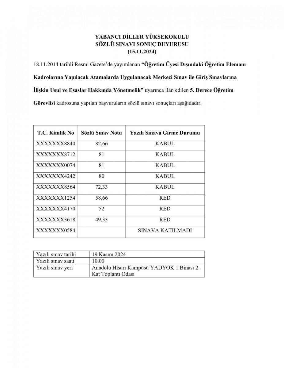 School of Foreign Languages 5th Degree Teaching Assistant Preliminary Evaluation Results