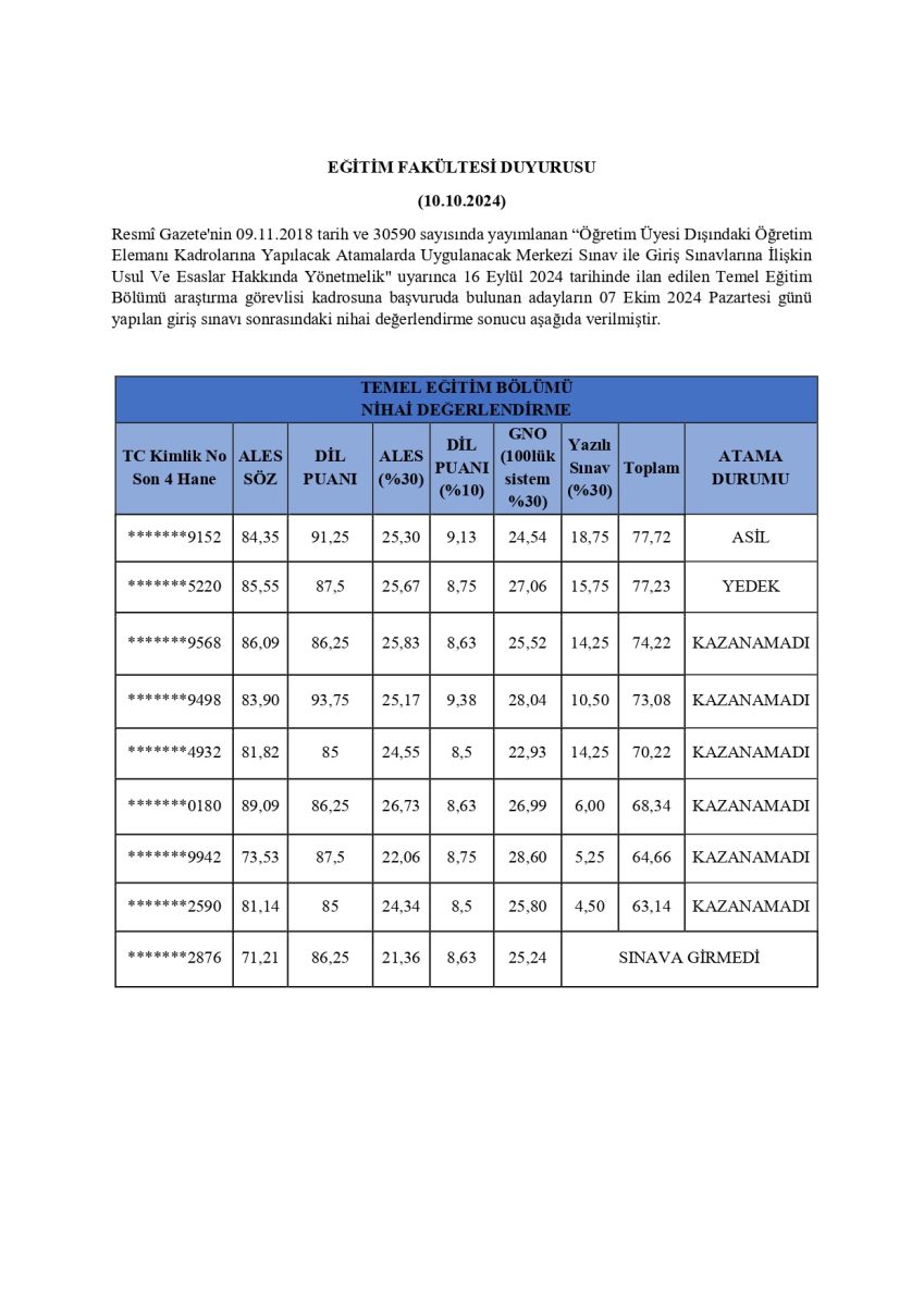 Faculty of Science and Letters Research Assistant Recruitment Evaluation Results