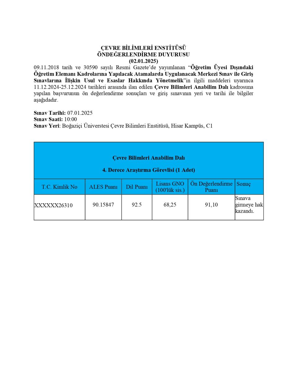 Çevre Bilimleri Anabilim Dalı Araştırma Görevlisi Alımı Ön Değerlendirme Sonucu