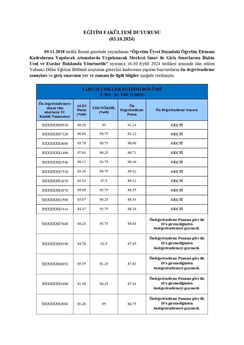 Yabancı Diller Eğitimi Bölümü Araştırma Görevlisi İlanı Ön Değerlendirme Sonuçları